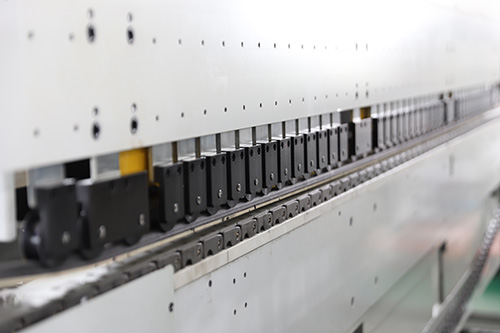 鏈條上方的兩排上壓緊輪的高度應(yīng)調(diào)節(jié)為(板厚減2mm),壓力調(diào)在0.25-0.35Mpa之間;各輔助壓緊高度應(yīng)為(板厚減0.5mm),壓力調(diào)節(jié)在0.1Mpa左右。